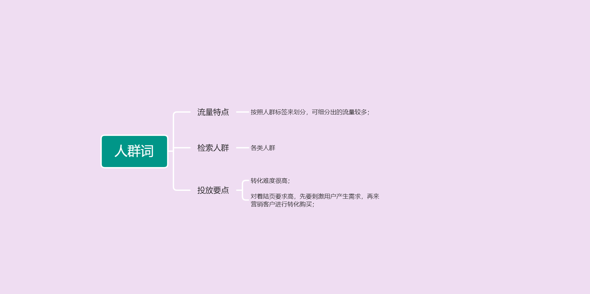四、人群词:网民未直接表达对产品/服务的需求,但搜索词表达了其它相关的兴趣点,与您的潜在客户群可能存在高度重合。